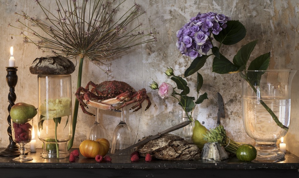Eine zentrale Rolle nimmt die Licht- und Schattenführung ein, um die Dinge effektvoll, oft geheimnisvoll, in Szene zu setzen. Viele Fotos zeigen eine opulente Fülle an Blumen, Gemüse, Früchten – und Tieren. Immer wieder begegnen uns ganze Fische, Krabben, Tierköpfe und ungerupftes Federvieh. Damit zieht in die Bilder der Schatten des Todes ein. Andere Bilder wirken ganz ruhig, fast meditativ.